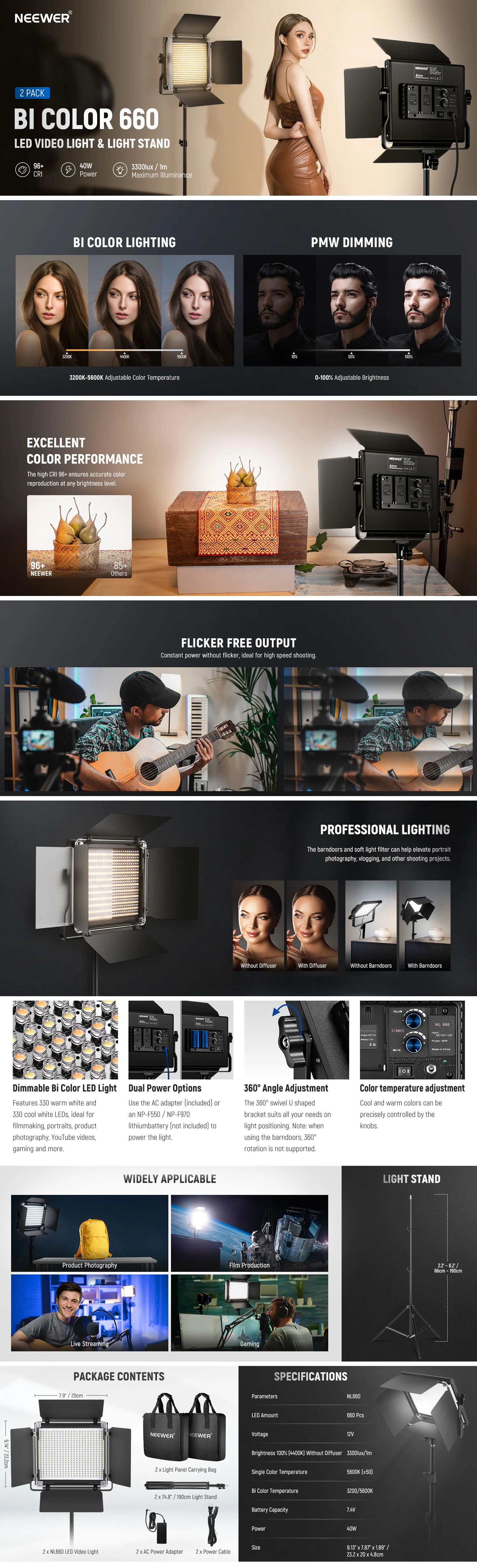 Luz LED de Estudio Bicolor Regulable – Con 330 LEDs blanco cálido y 330 LEDs blanco frío, esta luz de video LED 660 de 40W ofrece una iluminancia máxima de 3300 lux/1m, temperatura de color ajustable entre 3200K y 5600K, y brillo regulable de 0% a 100%. Su alto CRI de 96+ garantiza una reproducción de color auténtica. Voltaje: DC 12V; Voltaje de entrada: 100V–240V; Salida de batería: DC 14.8V. Una iluminación constante y sin parpadeos es esencial para cineastas, retratos, fotografía de productos, videos de YouTube, gaming y más.